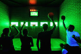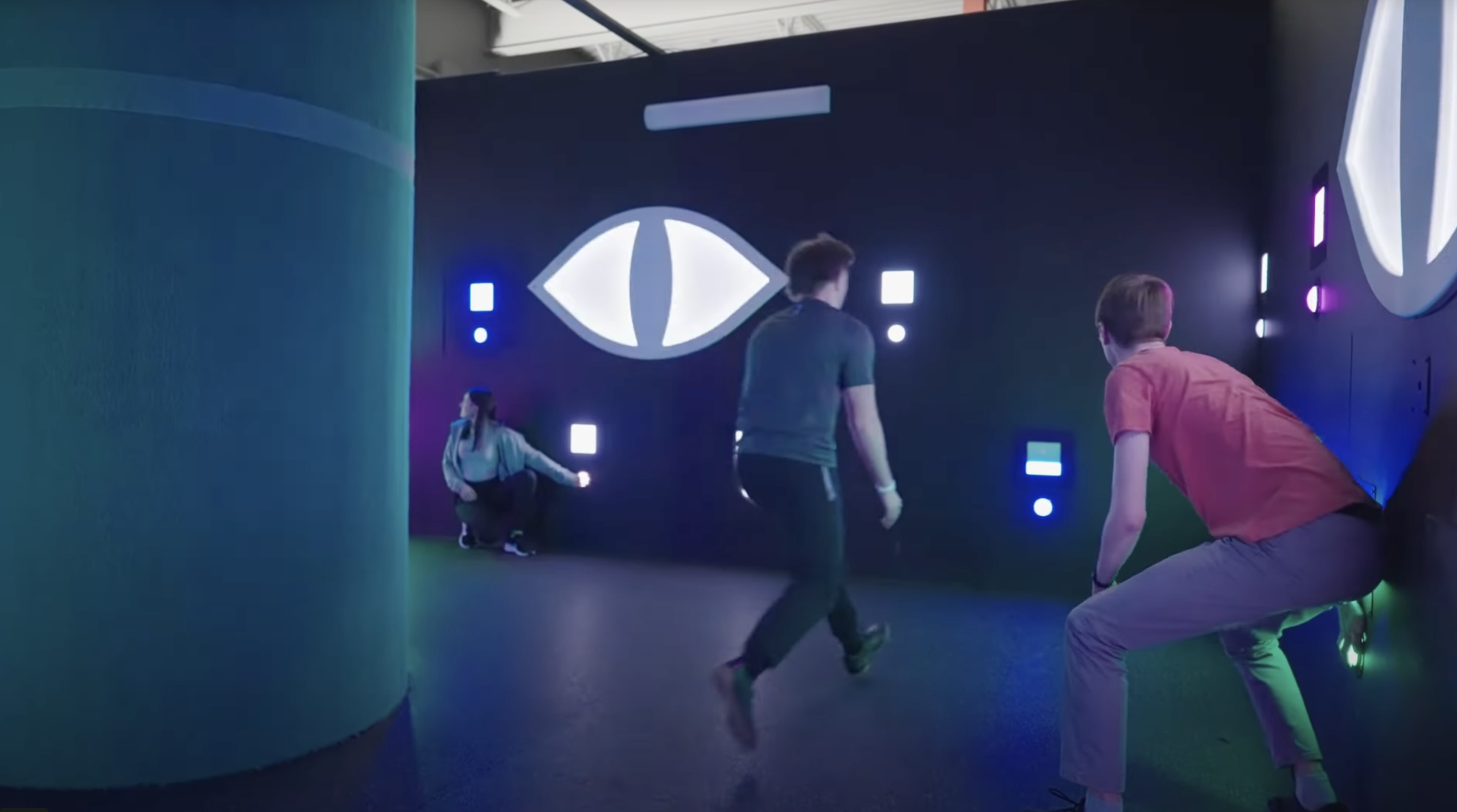 Expérience type escape room : esquiver des faisceaux laser en courant, sautant et rampant.